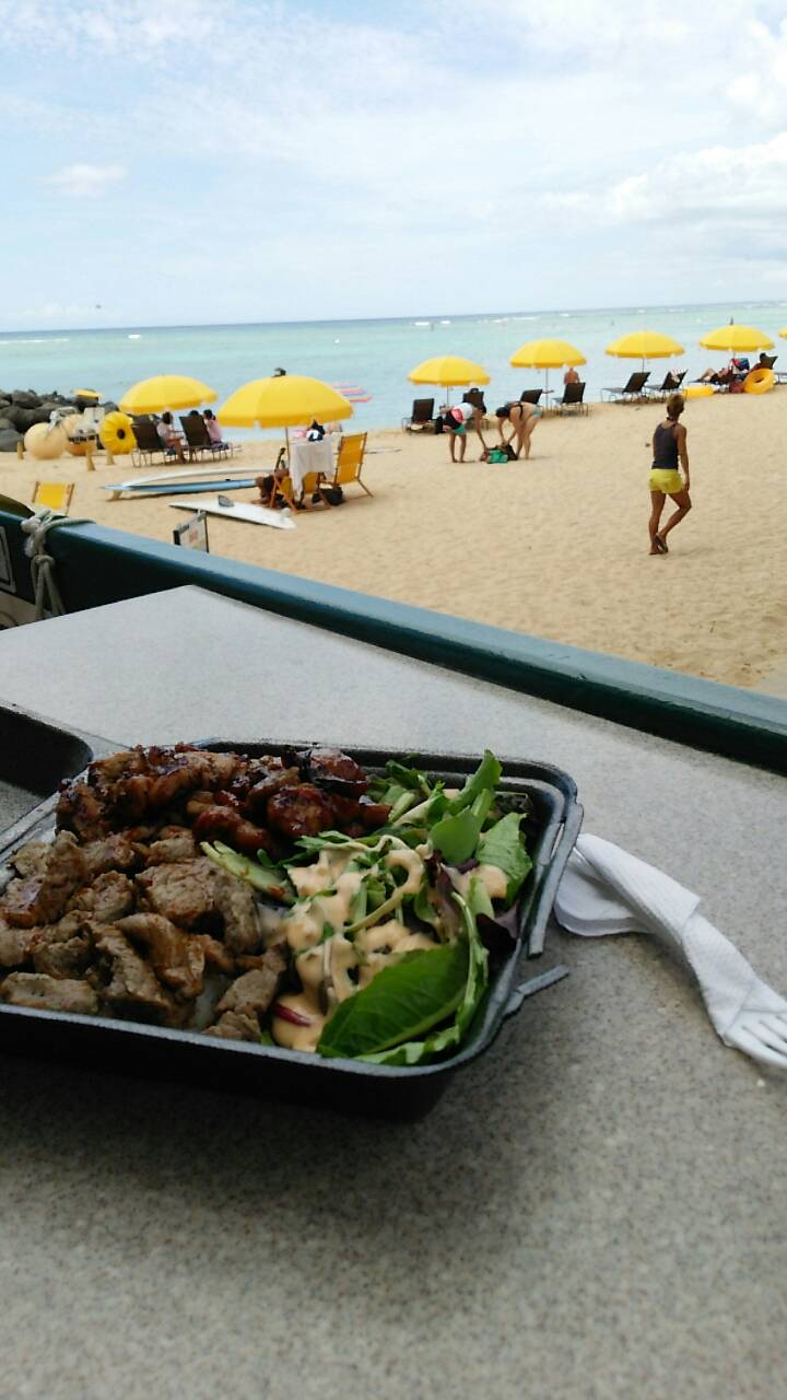 <ワイキキのビーチ沿い。お弁当はステーキシャックというお店のステーキ&チキン弁当。持ち前の英語力?(笑)を発揮してなぜか定員さんに気に入られ、最後はFrend!とか言われ握手を2回も求められる。でも言われたことの20%ぐらいしか理解できてない・・・>